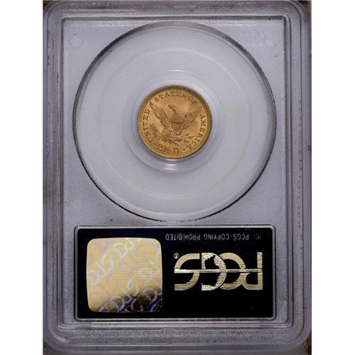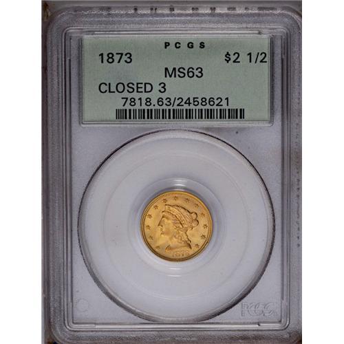 <B>1873<$2 1/2> Closed 3 MS63 PCGS.</B></I> Crisply struck despite slight softness on the chin and eagle's leg. A lustrous orange-gold piece that can be identified by a small rim ding at 4 o'clock. Encapsulated in a green label holder. Population: 51 in 63, 41 finer (4/06).