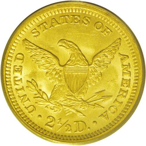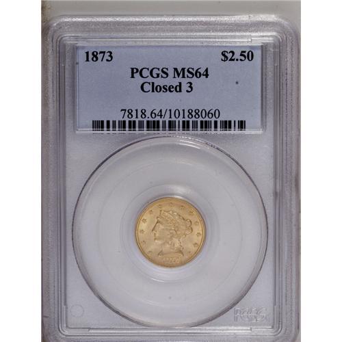 <B>1873<$2 1/2> Closed 3 MS64 PCGS.</B></I> A lustrous, reddish-gold near-Gem with glints of hazel on the highpoints of each side. Generally well produced, with slight softness on the eagle's left (facing) leg, but otherwise generously struck. A few scattered, light contact marks account for the grade.