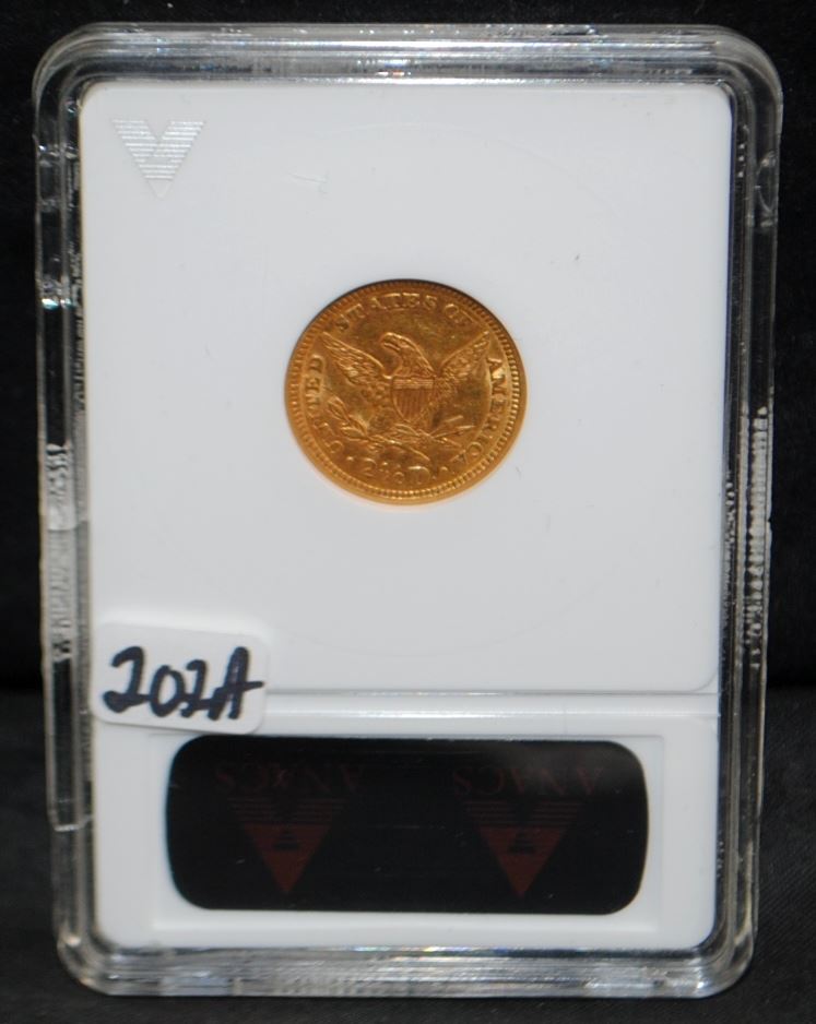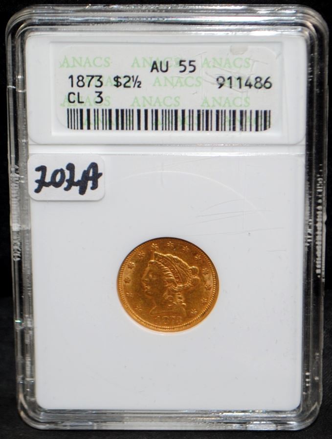 1873 $2 1/2 LIBERTY GOLD COIN (CLOSED 3) - ANACS AU55 (THE CURRENT COIN WORLD TRENDS LISTS AN AU50 @ $400.00 AND AN AU58 @ $450.00)