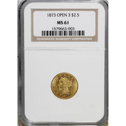 <B>1873 $2 1/2 Open 3 MS61 NGC.</B></I> . NGC Census: (128/258). PCGS Population (55/192). Mintage: 122,800. Numismedia Wsl. Price for NGC/PCGS coin in MS61: $390. (#7817)<BR><BR><B>Coin Engraver:</B> Christian Gobrecht<BR><BR><b>Shipping:</b> Coins & Currency (<a target="_blank" href="http://www.heritageauctions.com/common/shipping.php">view shipping information</a>)