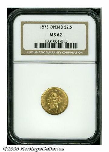 <B>1873<$2 1/2> Open 3 MS62 NGC.</B></I> More frequently seen than its Closed 3 counterpart, this is a well struck example that has rich pink-gold color and bright overall surfaces.