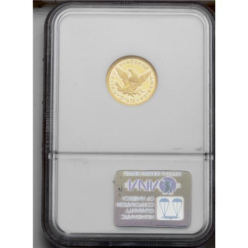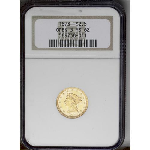 <B>1873<$2 1/2> Open 3 MS62 NGC.</B></I> This coin has satiny orange-gold surfaces with a solid strike on the obverse, while the reverse is slightly reflective. Abrasions in the field partly define the grade.