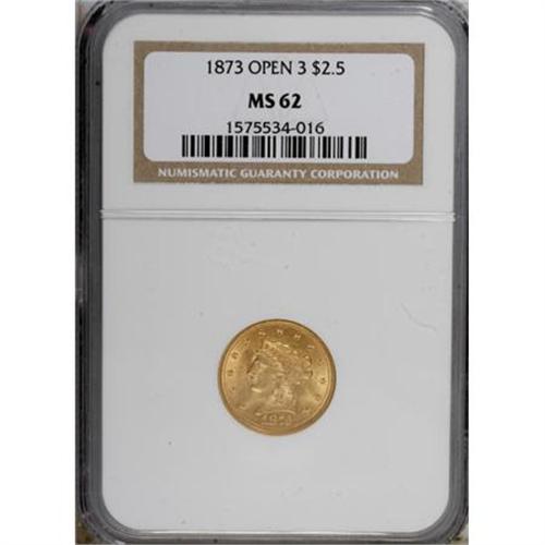 <B>1873 $2 1/2 Open 3 MS62 NGC.</B></I> NGC Census: (144/110). PCGS Population (88/101). Mintage: 122,800. Numismedia Wsl. Price for NGC/PCGS coin in MS62: $470. (#7817)<BR><BR><B>Coin Engraver:</B> Christian Gobrecht<BR><BR><b>Shipping:</b> Coins & Currency (<a target="_blank" href="http://www.heritageauctions.com/common/shipping.php">view shipping information</a>\)