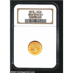 1873 $2 1/2 Open 3 MS63 NGC. A sharply struck piece with flashy luster and a mildly prooflike revers