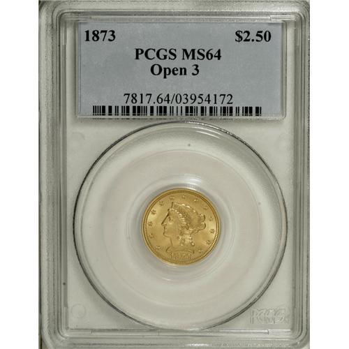 <B>1873 $2 1/2 Open 3 MS64 PCGS.</B></I> This pleasing near-Gem is powerfully struck and splendidly smooth, although careful rotation beneath a lens locates a couple of nearly imperceptible hairlines. The eye appeal is exemplary. Population: 35 in 64, 9 finer (2/07).<BR><BR><b>Shipping:</b> Coins & Currency (<a target="_blank" href="http://www.heritageauctions.com/common/shipping.php">view shipping information</a>)