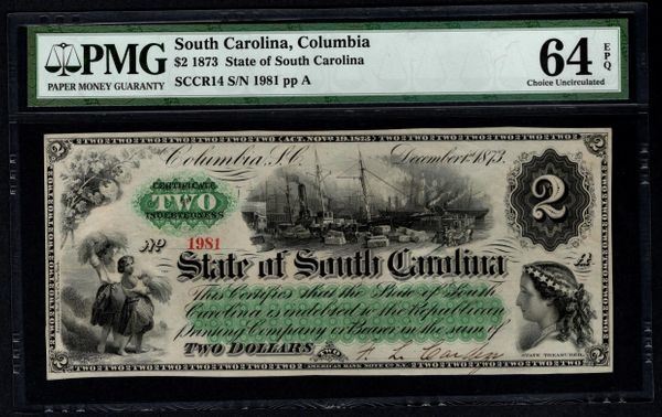 One 1873 $2 Columbia SC Note PMG 64EPQ.