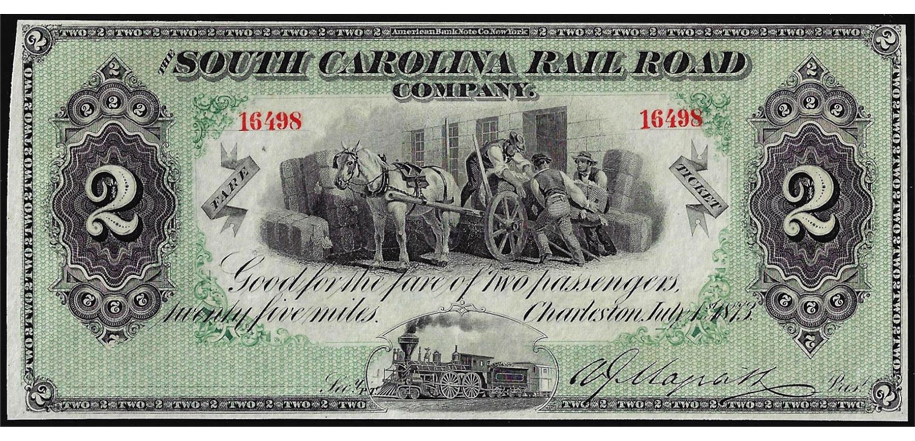 One 1873 $2 South Carolina Rail Road Company Obsolete Note.
