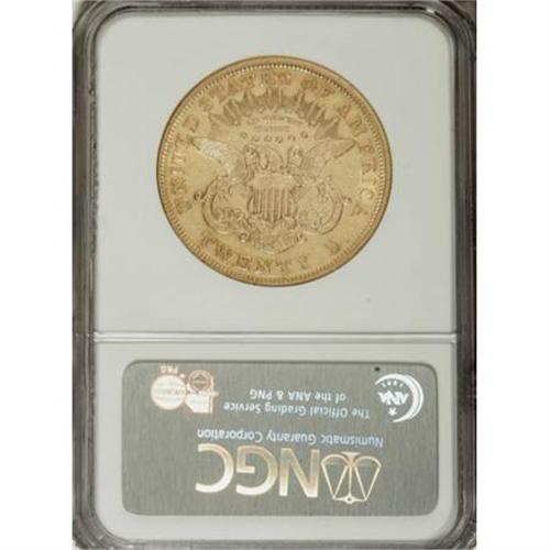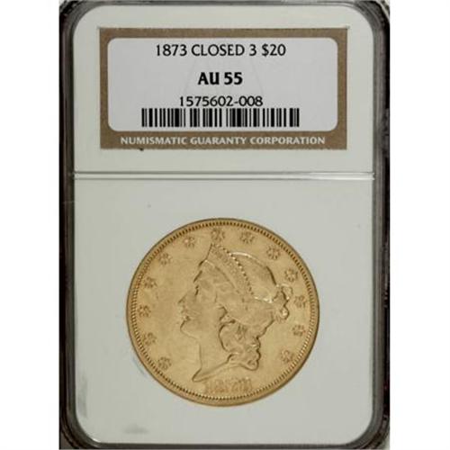 <B>1873 $20 Closed 3 AU55 NGC.</B></I> Struck before the change to the more readable Open 3 logotype, the 1873 Closed 3 double eagles are more elusive than their later counterparts. This straw-gold piece, well struck with light, scattered abrasions, retains much of its original luster.<BR><BR><B>Coin Engraver:</B> James B. Longacre<BR><BR><b>Shipping:</b> Coins & Currency (<a target="_blank" href="http://www.heritageauctions.com/common/shipping.php">view shipping information</a>\)