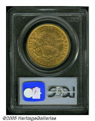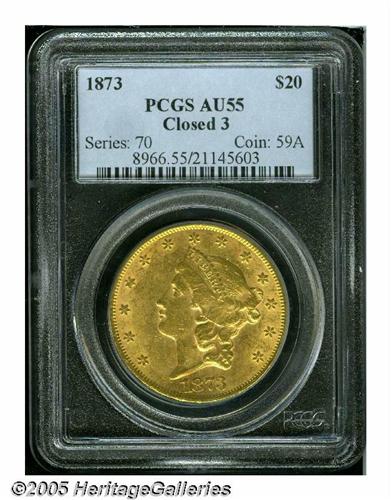 <B>1873<$20> Closed 3 AU55 PCGS.</B></I> The Closed 3 is the scarcest of the two varieties, especially in AU grade. This specimen has orange-gold color, with traces of luster seen in some of the protected areas. The design features are relatively well defined, though portions of Liberty's hair are weak. A few minute contact marks are scattered over each side.