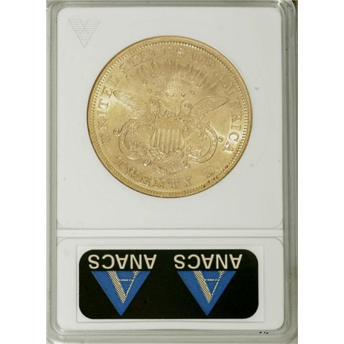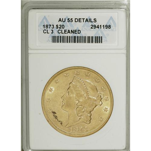 <B>1873 $20 Closed 3--Cleaned--ANACS. AU55 Details.</B></I> Lightly pitted near the first obverse star, but relatively free from hairlines given the ANACS notation. Luster dominates the reverse, but cannot cross the open fields. The Philadelphia Closed 3 variety is scarce, compared with its common Open 3 counterpart.<BR><BR><b>Shipping:</b> Coins & Currency (<a target="_blank" href="http://www.heritageauctions.com/common/shipping.php">view shipping information</a>)
