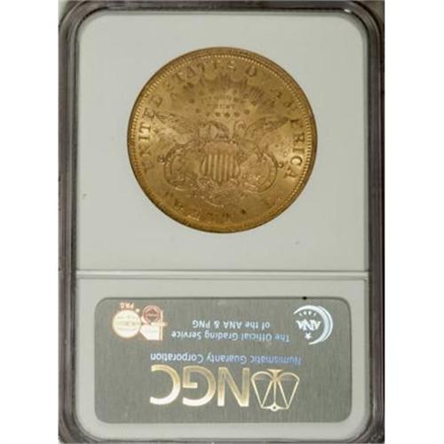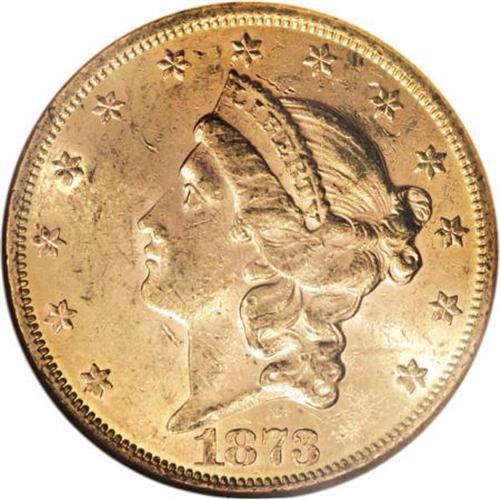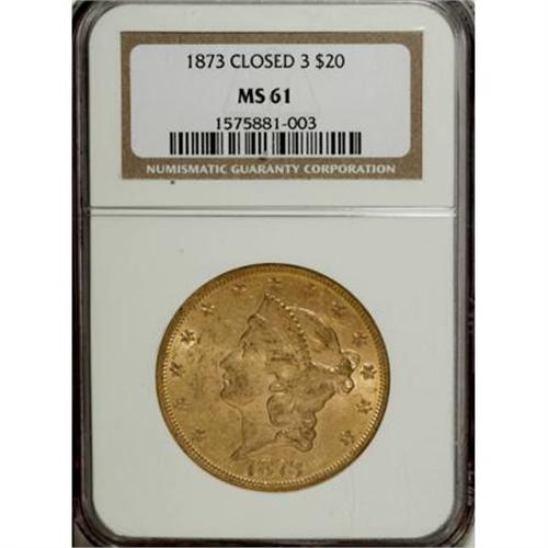 <B>1873 $20 Closed 3 MS61 NGC.</B></I> The high water mark for Type Two double eagle mintages occurred in 1873 when Philadelphia coined 1.7 million pieces. Open 3 and Closed 3 varieties were coined during the year, with Closed 3 pieces struck in limited quantities during the first couple of months. Although separate mintage figures for the two varieties are not recorded, the existence of monthly coinage data might give a ballpark range. Another approach is a population comparison. NGC and PCGS have certified 9,712 double eagles of 1873, with just 444 (4.6%) of the Closed 3 variety, suggesting a Closed 3 mintage of only 78,000 coins, the fifth lowest of any Type Two issue. Though lightly abraded, this frosty orange-gold piece is highly attractive with hints of pale pink toning.<BR><BR><B>Coin Engraver:</B> James B. Longacre<BR><BR><b>Shipping:</b> Coins & Currency (<a target="_blank" href="http://www.heritageauctions.com/common/shipping.php">view shipping information</a>\)