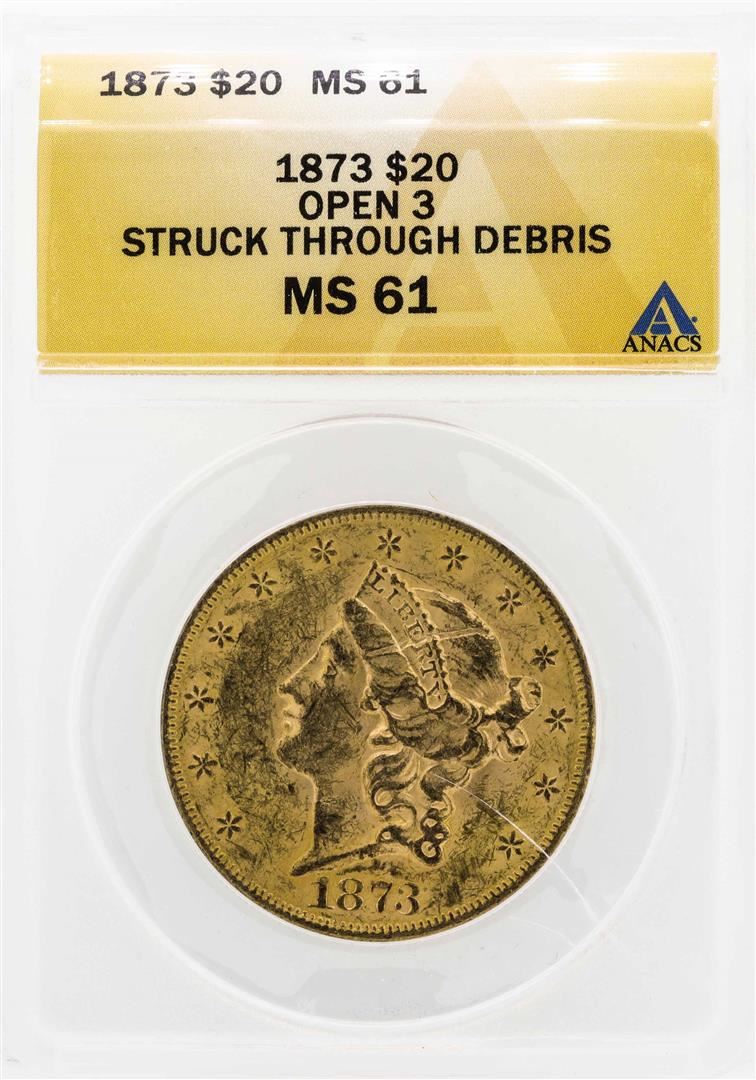 One 1873 $20 Liberty Head Double Eagle Gold Coin ANACS MS61 Open 3. ANACS Appraised.