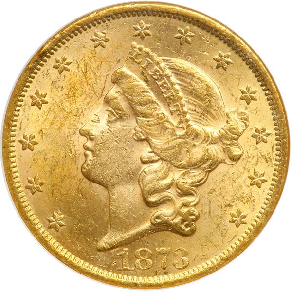 Coins of 1873 were made with Closed 3 in the date and Open 3 in the date. A quick glance at the 1873 Closed 3 date, made early in the year, resembled "1878," as the knobs on the 3 were close together. The more common Open 3 1873 $20 was created by filing away most of the bottom knob on the 3 of the date logotype and trimming the knob to a smaller size; dies punched with this modified date logotype are called Open 3 (PCGS # 8967) .