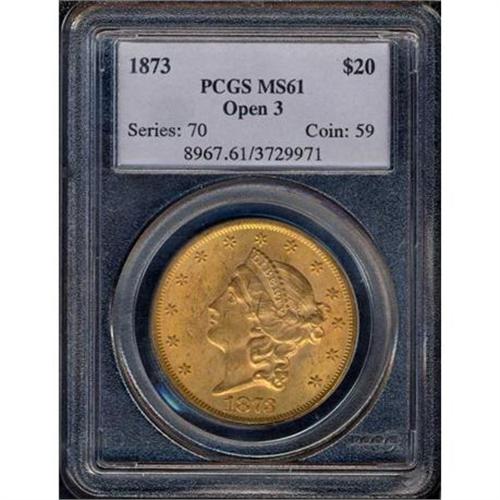 <b>1873 $20 Liberty. Open 3. PCGS graded MS61.</b> Affordable Type 2 twenty-dollar gold date, and the one to consider for a Type set <b>(PCGS # 8967)</b>