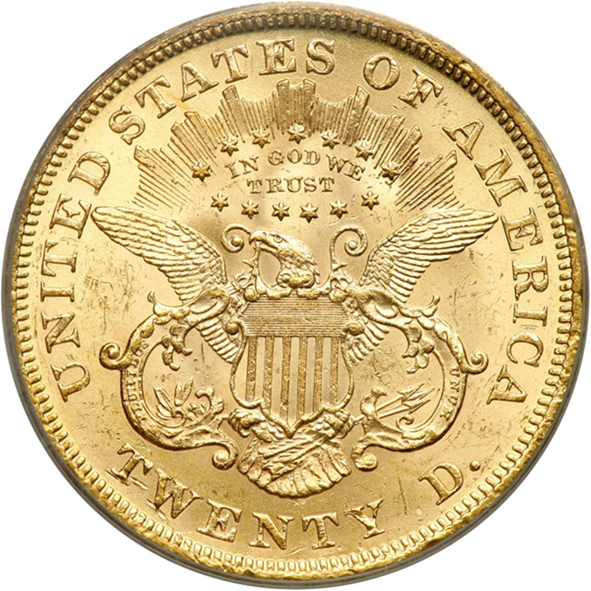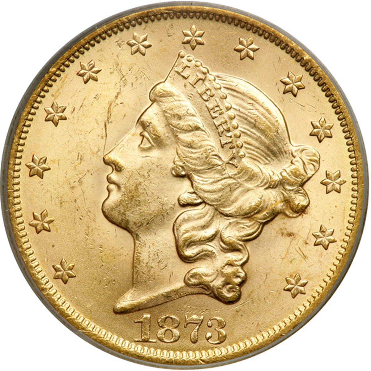 1873 $20 Liberty. Open 3. PCGS graded MS-62 PQ. CAC Approved. A nice untoned coin. Certainly should be regraded to MS63 as it has the qualifactions plus the "look", the eye-appeal, consistent with the grade (PCGS # 8967) .