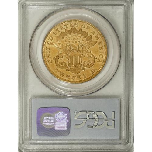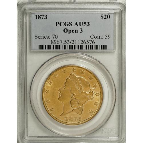 1873 $20 Open 3 AU53 PCGS. Both sides of this lightly