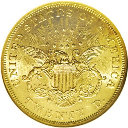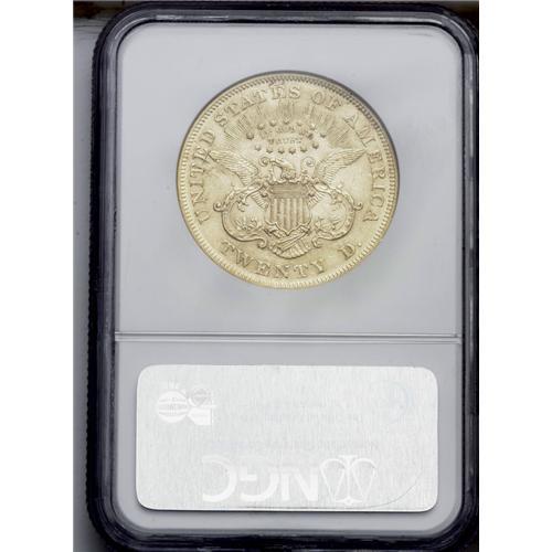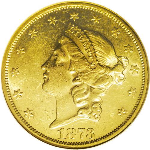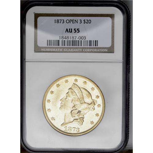<B>1873<$20> Open 3 AU55 NGC.</B></I> The more common variety of this P-mint delivery, the 1873 Open 3 double eagle is, nonetheless, a conditionally challenging issue. As befits the grade, the highpoints exhibit noticeable wear, and the surfaces carry numerous small abrasions throughout. Suitable remaining mint frost and ample definition characterize both sides and ensure this coin's pleasing appearance for the grade.