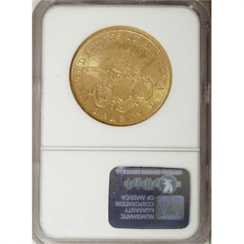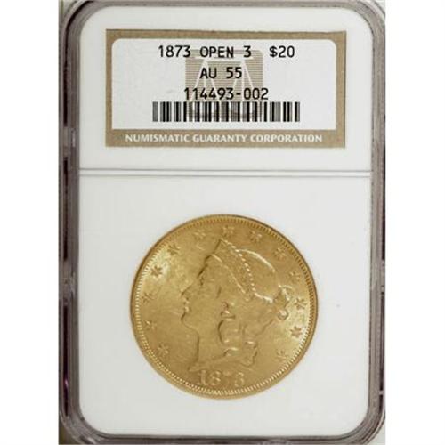 <B>1873 $20 Open 3 AU55 NGC.</B></I> NGC Census: (395/5107). PCGS Population (457/2989). Numismedia Wsl. Price for NGC/PCGS coin in AU55: $810. (#8967)<BR><BR><B>Coin Engraver:</B> James B. Longacre<BR><BR><b>Shipping:</b> Coins & Currency (<a target="_blank" href="http://www.heritageauctions.com/common/shipping.php">view shipping information</a>)