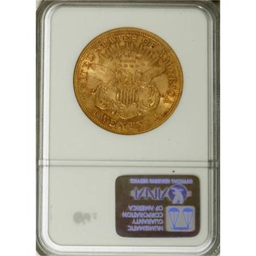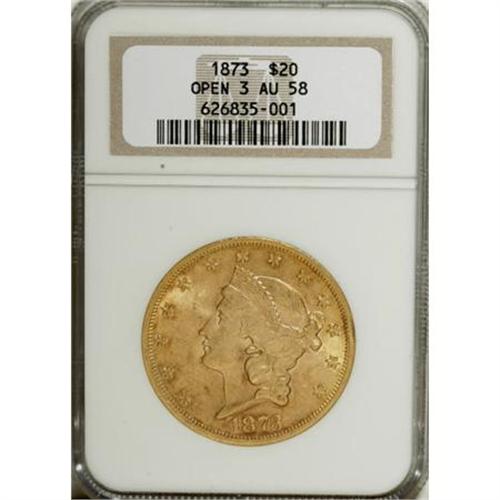 <B>1873 $20 Open 3 AU58 NGC.</B></I> NGC Census: (1829/3183). PCGS Population (579/2348). Numismedia Wsl. Price for NGC/PCGS coin in AU58: $740. (#8967)<BR><BR><B>Coin Engraver:</B> James B. Longacre<BR><BR><b>Shipping:</b> Coins & Currency (<a target="_blank" href="http://www.heritageauctions.com/common/shipping.php">view shipping information</a>)