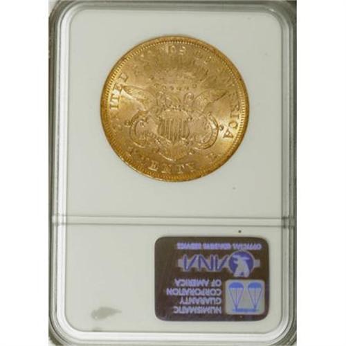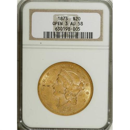 <B>1873 $20 Open 3 AU58 NGC.</B></I> NGC Census: (1829/3183). PCGS Population (579/2348). Numismedia Wsl. Price for NGC/PCGS coin in AU58: $740. (#8967)<BR><BR><B>Coin Engraver:</B> James B. Longacre<BR><BR><b>Shipping:</b> Coins & Currency (<a target="_blank" href="http://www.heritageauctions.com/common/shipping.php">view shipping information</a>)