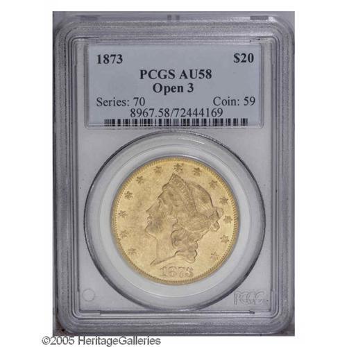 <B>1873<$20> Open 3 AU58 PCGS.</B></I> Luster is abundant but does not fully penetrate the open obverse field. A few marks on the cheekbone and fields. A suitable representative of the Type Two design.