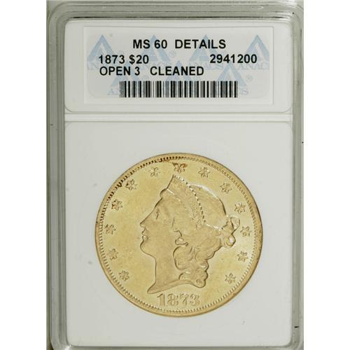 <B>1873 $20 Open 3--Cleaned--ANACS. MS60 Details.</B></I> The obverse rim has a ding at 2:30, but this flashy and well struck Type Two double eagle exhibits unbroken cartwheel sheen. Faint hairlines on the left obverse field account for the conservative ANACS assessment.<BR><BR><b>Shipping:</b> Coins & Currency (<a target="_blank" href="http://www.heritageauctions.com/common/shipping.php">view shipping information</a>)