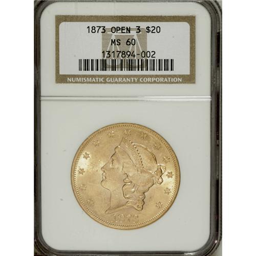 1873 $20 Open 3 MS60 NGC. NGC Census: (801/2262).