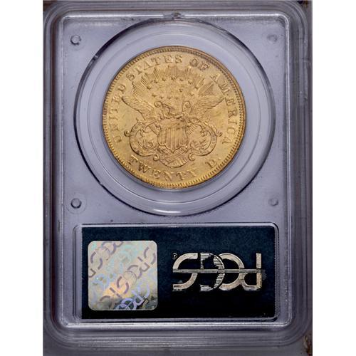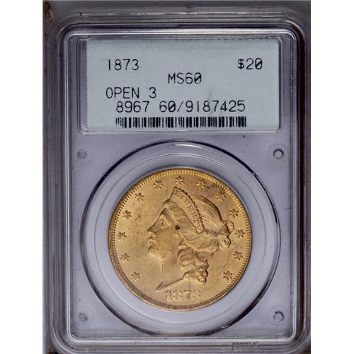 <B>1873<$20> Open 3 MS60 PCGS.</B></I> This Type Two type coin has essentially complete luster, although numerous wispy marks are present, in addition to a diagonal mark on the shield. Encapsulated in an early PCGS holder.