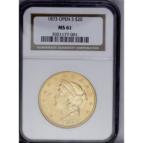 1873 $20 Open 3 MS61 NGC. A subtly lustrous yellow-gol