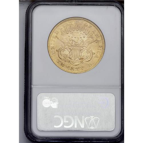 <B>1873<$20> Open 3 MS61 NGC.</B></I> A subtly lustrous yellow-gold piece that has few marks for the grade. Peach and orange highlights appear on the softly struck devices.
