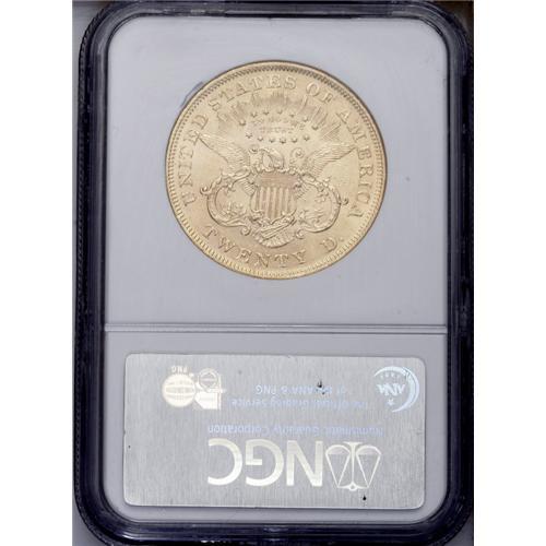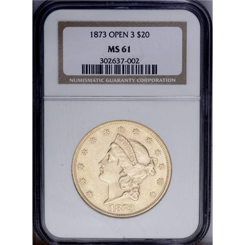 <B>1873 $20 Open 3 MS61 NGC.</B></I> Peach-gold surfaces display well struck design features. Several minute marks are evident, especially on the obverse.