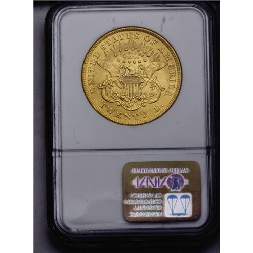 <B>1873<$20> Open 3 MS61 NGC.</B></I> Solidly in the Mint State category, but hindered by numerous obverse abrasions and slightly subdued luster. A tiny black spot of grease is noted on Liberty's hair bun.