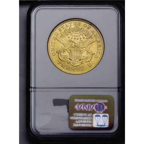 <B>1873<$20> Open 3 MS61 NGC.</B></I> The obverse field imparts a semi-reflective appearance, the reverse is frosty. Well struck with bright yellow-golden color, a number of small abrasions over the obverse explain the MS61 grade.