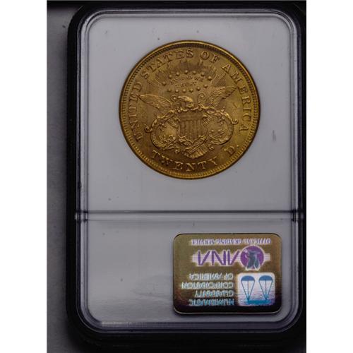 <B>1873<$20> Open 3 MS61 NGC.</B></I> Well struck with somewhat subdued luster. Heavily bagmarked on the obverse, limiting the grade to MS61.
