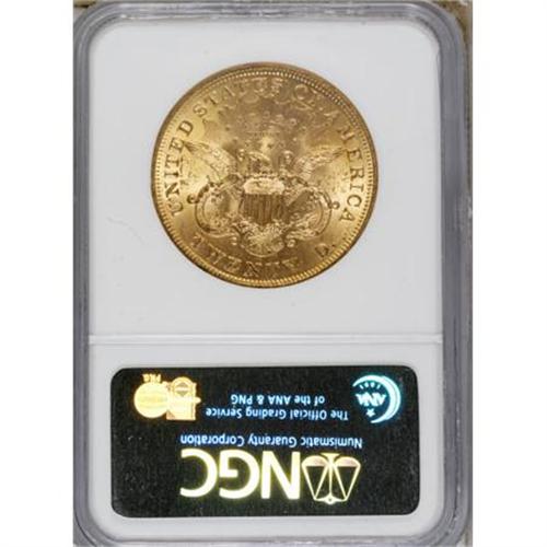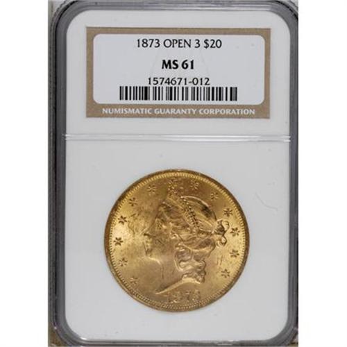 <B>1873 $20 Open 3 MS61 NGC.</B></I> The 1873 Open 3 is often called upon to represent the Type Two design, which bears the Motto IN GOD WE TRUST but abbreviates DOLLARS with D. Lustrous and crisply struck with distributed obverse marks.<BR><BR><b>Shipping:</b> Coins & Currency (<a target="_blank" href="http://www.heritageauctions.com/common/shipping.php">view shipping information</a>)