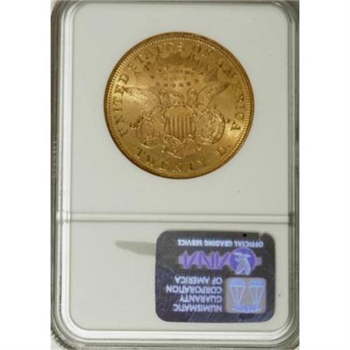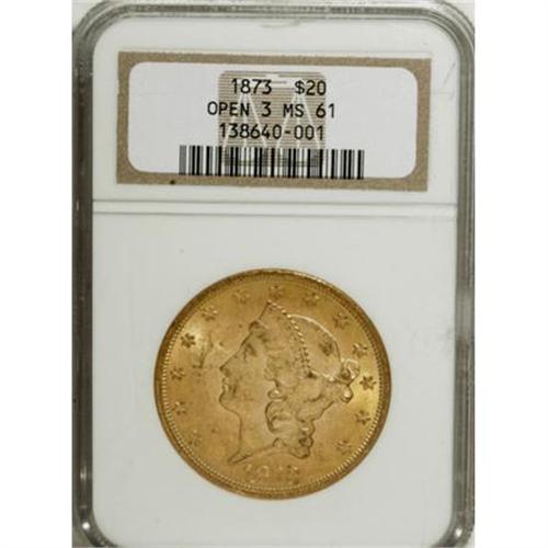 <B>1873 $20 Open 3 MS61 NGC.</B></I> Highly lustrous and richly toned, this example displays deep apricot-gold and greenish coloration. The obverse is somewhat scuffy, but the reverse only has a few surface blemishes. <BR><BR><B>Coin Engraver:</B> James B. Longacre<BR><BR><b>Shipping:</b> Coins & Currency (<a target="_blank" href="http://www.heritageauctions.com/common/shipping.php">view shipping information</a>)