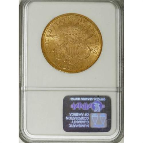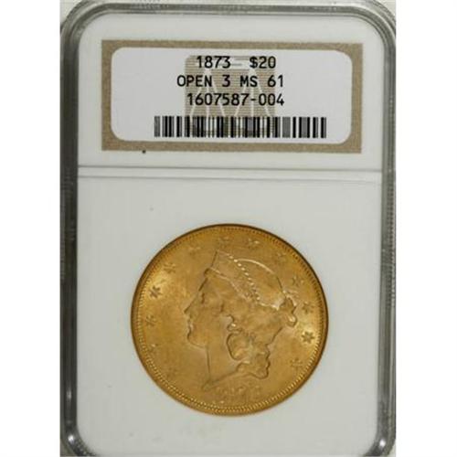 <B>1873 $20 Open 3 MS61 NGC.</B></I> This MS61 apricot-gold double eagle displays the most potent luster in the areas around and in the recesses of the design elements. The motifs are well defined, and the few small marks present are consistent with the grade designation.<BR><BR><B>Coin Engraver:</B> James B. Longacre<BR><BR><b>Shipping:</b> Coins & Currency (<a target="_blank" href="http://www.heritageauctions.com/common/shipping.php">view shipping information</a>)
