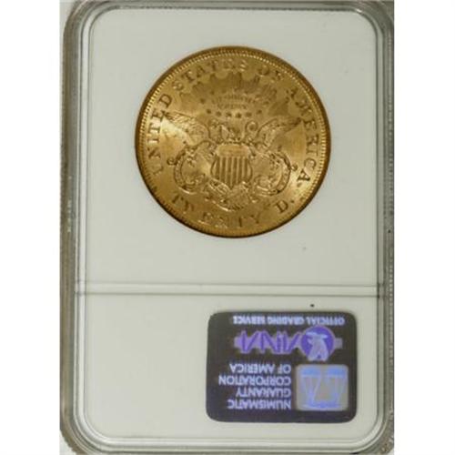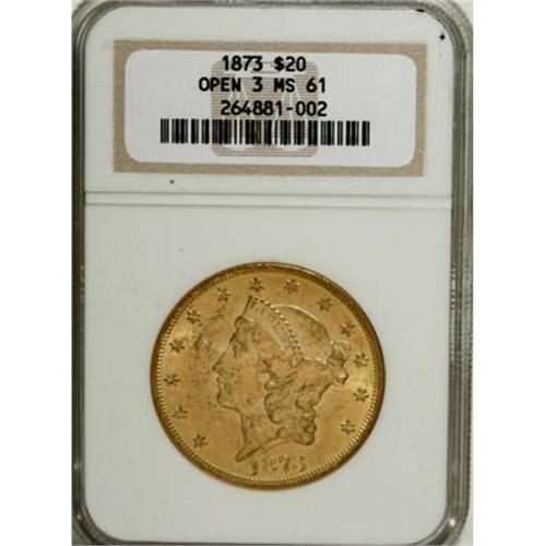 <B>1873 $20 Open 3 MS61 NGC.</B></I> Both sides possess soft luster and warm honey-gold patina, and a well directed strike leaves good definition on the design elements. The grade is determined by a few minute contact marks and scuffs, somewhat more so on the obverse.<BR><BR><B>Coin Engraver:</B> James B. Longacre<BR><BR><b>Shipping:</b> Coins & Currency (<a target="_blank" href="http://www.heritageauctions.com/common/shipping.php">view shipping information</a>)