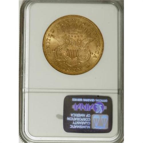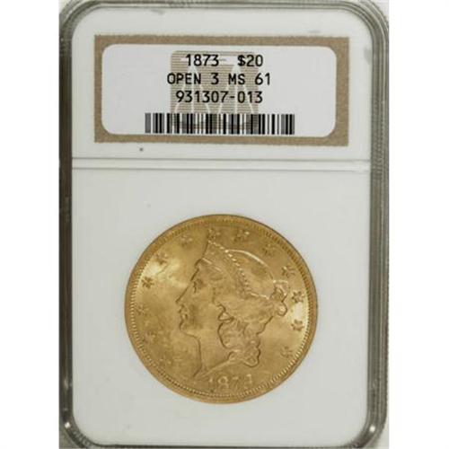 <B>1873 $20 Open 3 MS61 NGC.</B></I> Soft luster exudes from peach-gold surfaces that exhibit nicely defined design elements. A few more marks are noted on the obverse than the reverse.<BR><BR><B>Coin Engraver:</B> James B. Longacre<BR><BR><b>Shipping:</b> Coins & Currency (<a target="_blank" href="http://www.heritageauctions.com/common/shipping.php">view shipping information</a>)