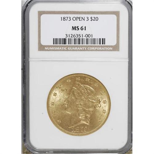 <B>1873 $20 Open 3 MS61 NGC.</B></I> NGC Census: (1716/726). PCGS Population (855/933). Numismedia Wsl. Price for NGC/PCGS coin in MS61: $1,350. (#8967)<BR><BR><B>Coin Engraver:</B> James B. Longacre<BR><BR><b>Shipping:</b> Coins & Currency (<a target="_blank" href="http://www.heritageauctions.com/common/shipping.php">view shipping information</a>)
