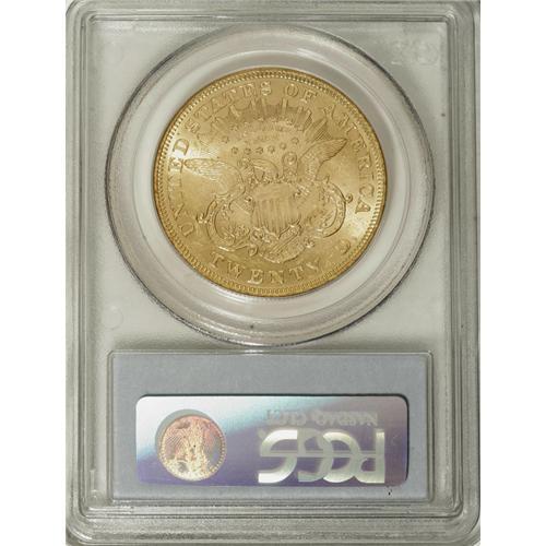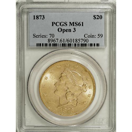 <B>1873 $20 Open 3 MS61 PCGS.</B></I> Recent terminology changes have turned the old "Closed 3" into "Close 3," more accurately, since the loops of the 3 are still open but more "close" than on the Open 3. This Open 3 piece is moderately abraded but brilliantly lustrous, with yellow-gold, radiant surfaces.<BR><BR><b>Shipping:</b> Coins & Currency (<a target="_blank" href="http://www.heritageauctions.com/common/shipping.php">view shipping information</a>)