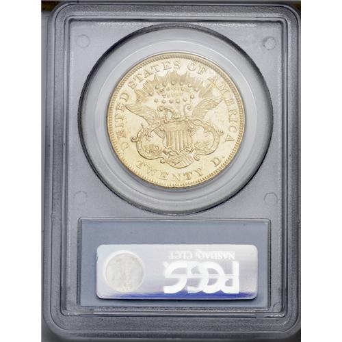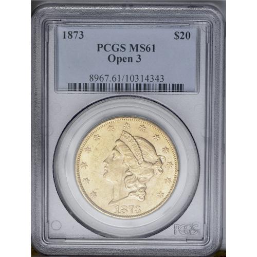 <B>1873<$20> Open 3 MS61 PCGS.</B></I> The LIB in LIBERTY is nicely die doubled north. The cartwheel luster is unbroken, although the obverse in particular has its share of small marks. A vertical slide mark on the portrait is unimportant for the grade.