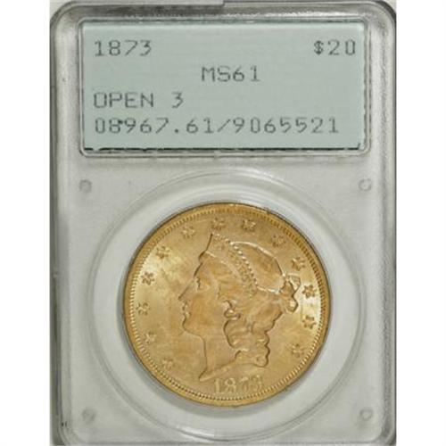 <B>1873 $20 Open 3 MS61 PCGS.</B></I> A bold striking with the numerous abrasions associated with the grade on the obverse and, as often seen, a noticeably finer reverse.<BR><BR><B>Coin Engraver:</B> James B. Longacre<BR><BR><b>Shipping:</b> Coins & Currency (<a target="_blank" href="http://www.heritageauctions.com/common/shipping.php">view shipping information</a>\)