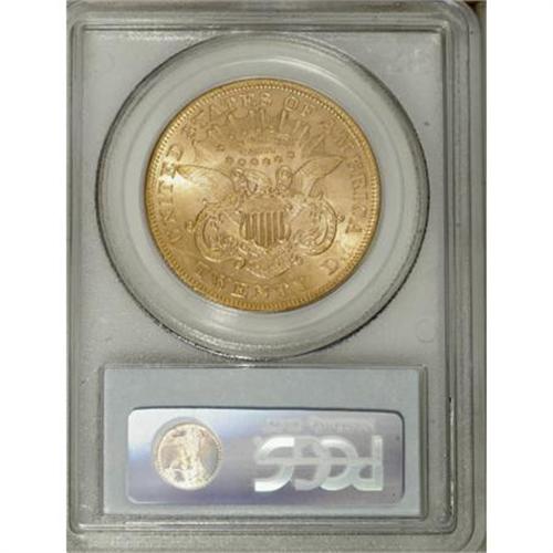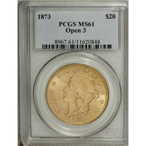 <B>1873 $20 Open 3 MS61 PCGS.</B></I> A satiny, unworn wheat-gold example that shows faint hints of green at the margins. This Open 3 coin offers excellent peripheral detail with only a touch of central softness, though a number of wispy abrasions preclude a better grade.<BR><BR><B>Coin Engraver:</B> James B. Longacre<BR><BR><b>Shipping:</b> Coins & Currency (<a target="_blank" href="http://www.heritageauctions.com/common/shipping.php">view shipping information</a>)