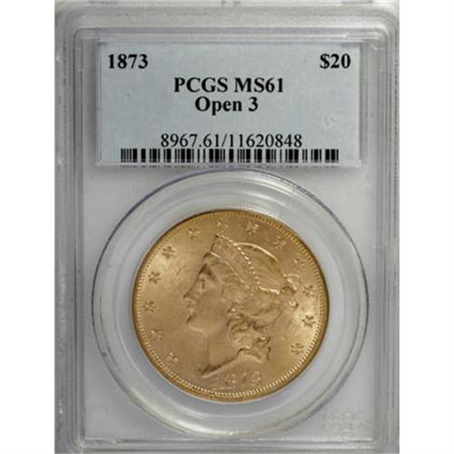 <B>1873 $20 Open 3 MS61 PCGS.</B></I> A Mint State wheat-gold example that shows faint hints of green at the margins. This Open 3 variety offers excellent peripheral detail with only a touch of central softness, though a number of wispy abrasions on the satiny surfaces preclude a better grade.<BR><I>From The Wild West #1 NGC Registry of Type Three Double Eagles.</B></I><BR><BR><B>Coin Engraver:</B> James B. Longacre<BR><BR><b>Shipping:</b> Coins & Currency (<a target="_blank" href="http://www.heritageauctions.com/common/shipping.php">view shipping information</a>)