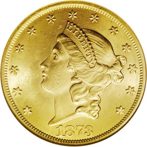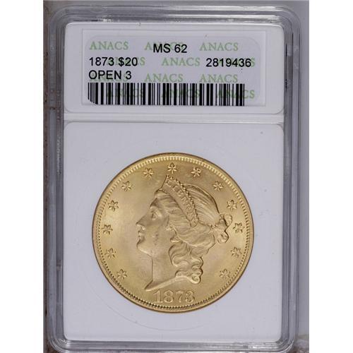 <B>1873 $20 Open 3 MS62 ANACS.</B></I> One of the more available Type Two twenties, the Open 3 1873 is often used as a type coin. This piece has soft, frosted mint luster and a light overlay of reddish patina. Minimally abraded for the grade and well struck.