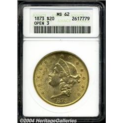 <B>1873<$20> Open 3 MS62 ANACS.</B></I> The most readily obtainable issue of this conditionally challenging type, this coin is earmarked for inclusion in a BU quality type set. Frosty in luster quality, both sides present a lovely pink-gold appearance. The strike is appreciably sharp for a Type Two Double Eagle, and numerous, scattered abrasions are well within the context of the MS62 level. <BR><BR><B>Important notice:</B> Heritage usually auctions material at the rate of 200-250 lots per hour. On some occasions eBay Live bid software or the Internet may not be able to keep up with the pace of the auction. We recommend placing a realistic absentee bid now as insurance to avoid disappointment. Occasionally the auctioneer may eliminate or reject an eBay Live bid, and the auctioneer may also reopen a lot after the close of the eBay live bidding (usually because we missed an audience bid), and may reject your bid even if it shows you as the winning bidder. By bidding via eBay Live, you agree that Heritage may award the lot to another bidder at its sole discretion under the circumstances described above or any other reasonable circumstances. Since eBay bids are not shown to us until we open the lot on the floor, we treat those bids just like floor bids. In most cases the floor responds before the eBay bid is presented to us, due to Internet lag time, so for consistency we have made it a policy that floor bids are always considered first over tie eBay live bids. Also please note that all Heritage lots purchased through eBay Live carry a 20% Buyer's Premium. Please make sure you read the Terms and Conditions before you bid. </span></font></tr></table></td></tr></table>