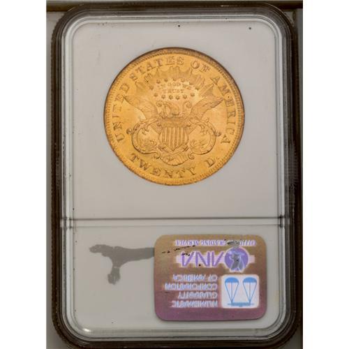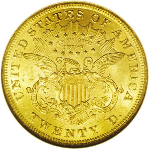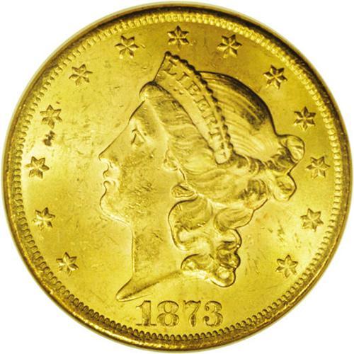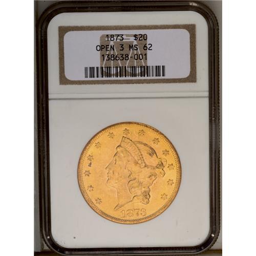 <B>1873<$20> Open 3 MS62 NGC.</B></I> Golden tones radiate from the modestly abraded surfaces. Abrasions are typically harsh to the design elements on many Liberty double eagles. This coin has good detail despite the visible contact marks and there are several abrasions of note on Liberty's cheek.