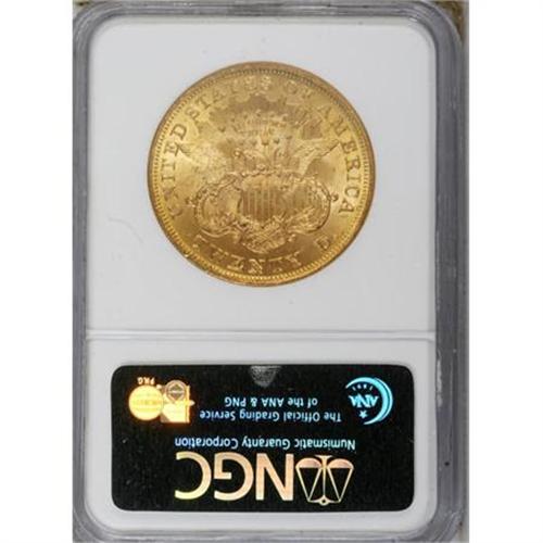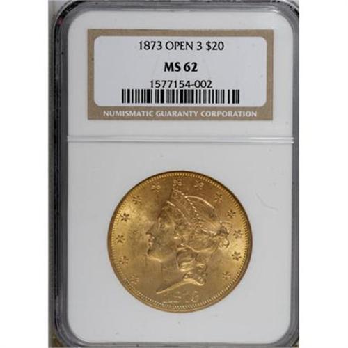 <B>1873 $20 Open 3 MS62 NGC.</B></I> A well struck sun-gold example with pleasing luster, struck from the later Open 3 logotype with its distinct final digit. Numerous scattered marks and a few more significant abrasions define the grade.<BR><BR><B>Coin Engraver:</B> James B. Longacre<BR><BR><b>Shipping:</b> Coins & Currency (<a target="_blank" href="http://www.heritageauctions.com/common/shipping.php">view shipping information</a>)