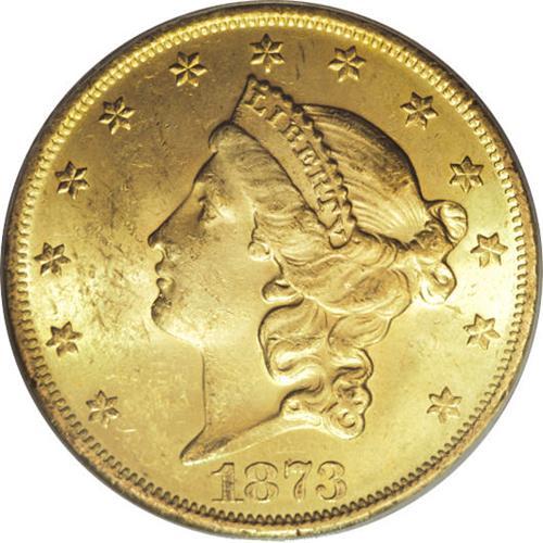 <B>1873 $20 Open 3 MS62 PCGS.</B></I> A likely type coin candidate for a Type Two twenty, the surfaces are pleasingly lustrous and show only minimal abrasions and luster grazes. Sharply struck throughout. Medium orange-gold color covers each side of this significant and challenging type coin.<BR><BR><b>Shipping:</b> Coins & Currency (<a target="_blank" href="http://www.heritageauctions.com/common/shipping.php">view shipping information</a>)